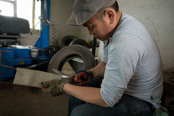Sonoo uses shears to cut hard canvas fire hose into patches that will be used to extend the life of macerated Russian tires.