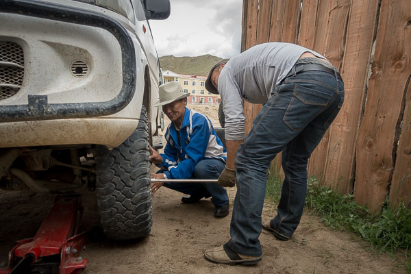 Travel is also difficult because the small black dots you see connecting the lines on the map don't mean what you think they mean. They may mean that you can buy drinking water, but not necessarily that you can get a tire fixed. In western Zavkhan, these dots don't mean that when you are near them you can connect to a mobile phone carrier, or that if you can get to one of these dots, that you could buy a part for the particular year and model of Japanese mini-van you are riding in. These are not facts that jump out at you when you are sitting at your table at home looking at the map, but they do occupy your imagination once you have helped your driver install your last spare tire, or in the middle of the road, as you grind to a halt with a bigger problem.