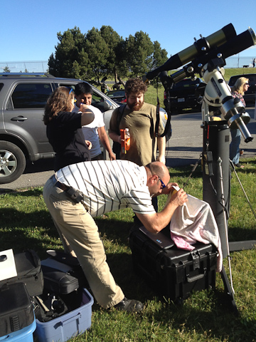 I had planned to be more prepared for this, but when the beautiful clear afternoon finally got here, I was still bogged down with phone calls and equipment that would not work, along with people who seem to be being paid to be useless at troubleshooting scanner problems. So I figured I had time for a run, then I would drive up to the lake to see what I could see with the pinhole setup I had put together. But on my run over Cobbs Hill, there were already many people set up for the event, and as I stopped to talk, they showed me the very first of the transit.