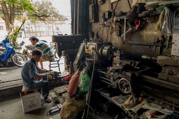 Near the railroad tracks there are dozens of these small, unlit shops, some of which are making door hinges, as this one is. Others are fabricating huge parts that are cut out of steel plate an inch thick.